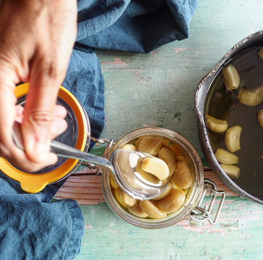 The sweetness released from garlic by slowly poaching is just magic. I mean on a Hermione Granger level. The mellow cloves can be used in so many different ways, and I’ve listed a few of my favourite below the recipe. I have used six garlic heads, but just use however many you have.